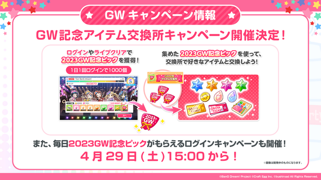 2023年4月29日(土)15時より、「GW記念アイテム交換所キャンペーン!」を開催する。GW記念アイテム交換所では、期間中にログインやライブをクリアすることで獲得できる特別アイテム「2023GW記念ピック」を使って、「★3以上確定チケット」などの様々なアイテムと交換することができる。