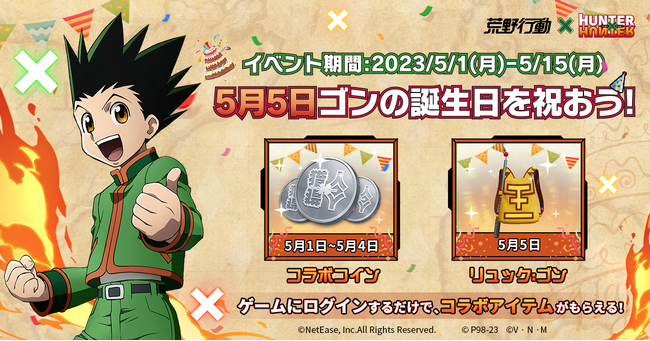 NetEase Gamesはバトルロワイヤルゲーム『荒野行動』にて、2023年5月1日から5月15日の期間中、『HUNTER×HUNTER』とのコラボイベントを開催する。
