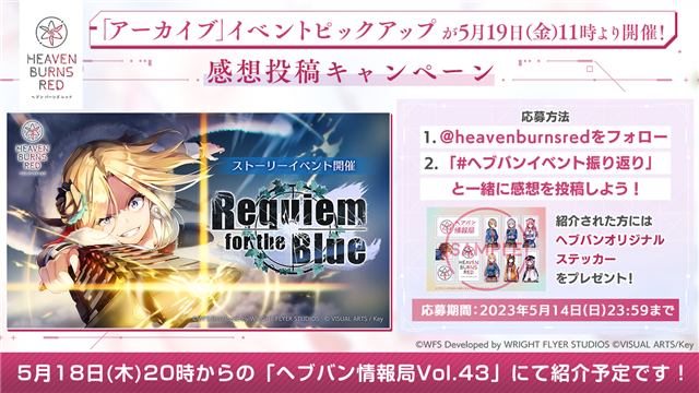 ストーリーイベント「Requiem for the Blue」の感想を、ハッシュタグ「#ヘブバンイベント振り返り」と一緒に投稿するTwitterキャンペーンを開催中!ヘブバン情報局の放送内で紹介された方(最大10名)にオリジナルステッカーをプレゼント!キャンペーン詳細はヘブンバーンズレッド公式Twitter(@heavenburnsred)で確認できる。