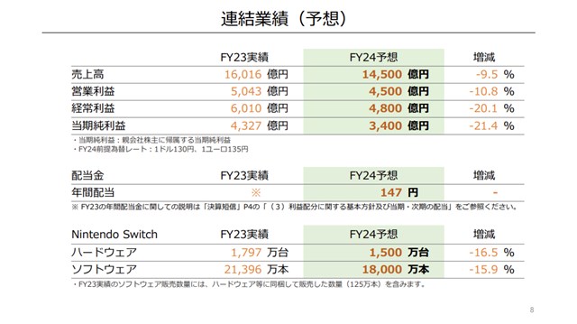 また、同社は続く2024年3月期の業績予想の前提として、Nintendo Switchの販売状況の予想を開示しているが、ハードウェアは前期比16.5%減の1500万台、ソフトウェアは同15.9%減の1億8000万本としている。