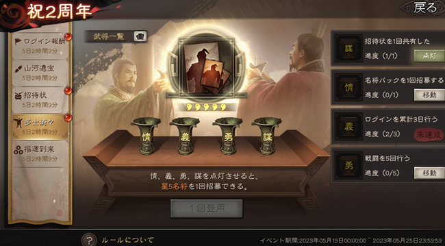 過去勢力値が300以上の君主様が情、義、勇、謀の任務を達成すると対応する酒杯が点灯可能になり、4つすべての酒杯を点灯すると必ず星5武将を獲得する招募ができます。