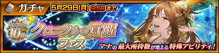 また、5月29日(月)9:59まで、「クロニクルの覚醒【歌聖】 ムジカ」の強さを体験できるお試しクエストや、「クロニクルの覚醒【歌聖】 ムジカ」をSPゲストで使って挑む“限定戦”なども期間限定で配信する。