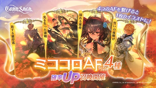 4種類のAFをすべてを揃えると1枚の絵となる「ミココロAF」の確率UP召喚イベントを開催しております!ぜひ4種全てを揃え、美しい絵柄をご覧ください!