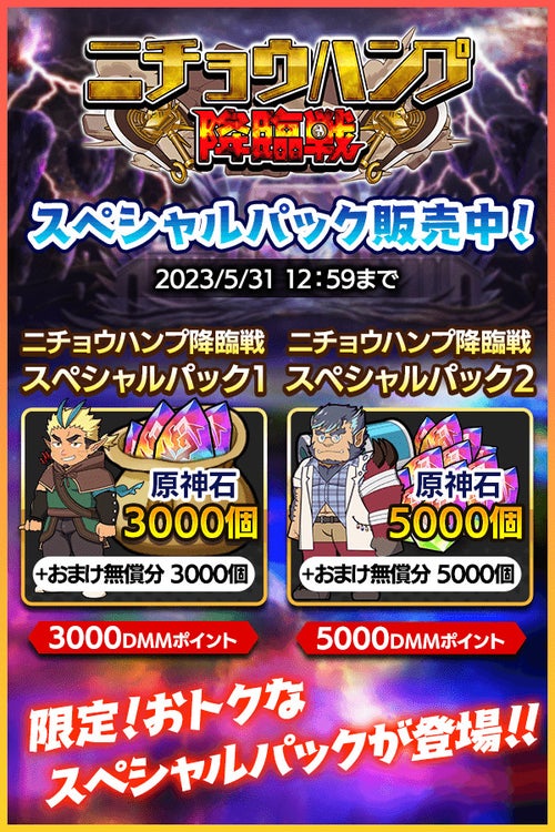 イベント期間中、原神石がおトクに購入できる「ニチョウハンプ降臨戦スペシャルパック」が2種登場!