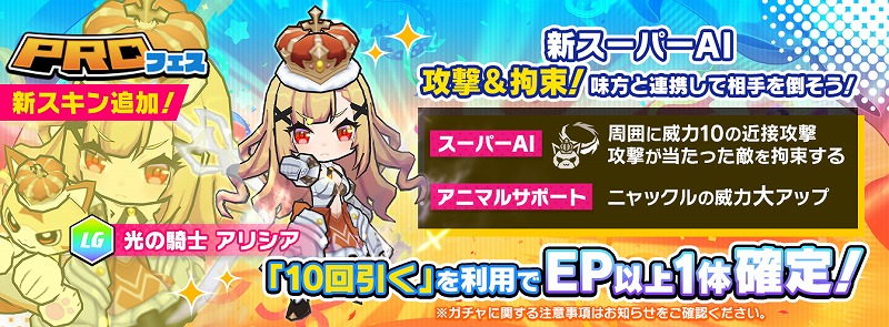 ハーフアニバーサリーを記念し、新スキン「LG 光の騎士アリシア」が登場。固有のSPAIでは近接攻撃効果に加え、攻撃が当たった敵を拘束する強力な効果を発揮する。さらにSPAIは見た目が特別仕様のニャックルになっており、かわいいお揃いコーデを楽しめる。