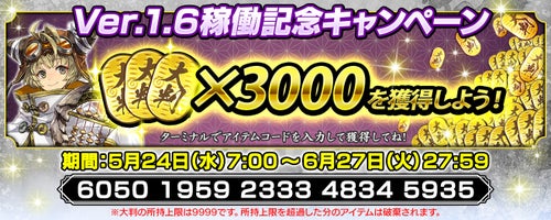また、今回の新バージョンの稼働を記念して、ターミナルにアイテムコードを入力した全員に大判3,000枚をプレゼントするキャンペーンも実施。
