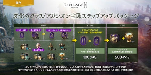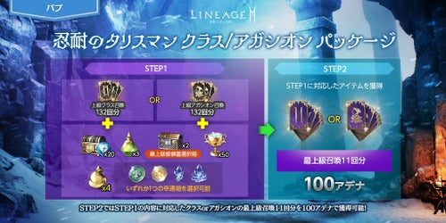 「インナドリルの宝珠箱(刻印)」50個に、クラスまたはアガシオンのマスター召喚6回分と最上級召喚44回分、「光る啓示の証幸運箱(刻印)」10個、「上級覚醒のポーション(刻印)」5個などがセットになった「変化のクラス/アガシオン宝珠ステップアップ パッケージ」が登場しました。