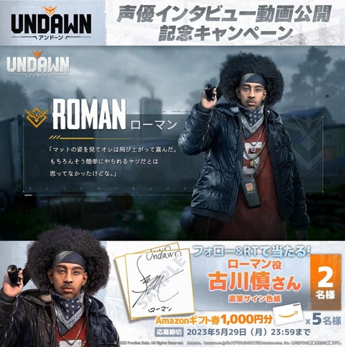 2023年5より、本作に登場するキャラクター・ローマンを演じる声優の古川慎さんのインタビュー映像を公開しました。映像の公開を記念して、『Undawn』公式Twitterにて、抽選で2名様にローマン役の古川慎さんの直筆サイン色紙が、5名様にAmazonギフト券1,000円分が当選するキャンペーンを実施いたします。