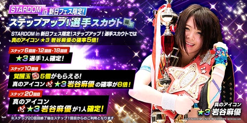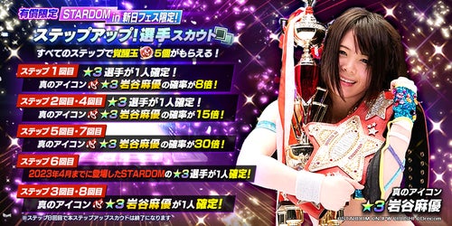 新日SSは2023年5月31日(水)メンテナンス終了後から、スターダムより新規育成選手として、★3「[真のアイコン]岩谷麻優」が登場する「STARDOM in 新日フェス限定!ステップアップ!選手スカウト」を開催している。本スカウトは、10連スカウトを既定回数行うと、ラインナップに含まれる★3選手からいずれか1人を確定で獲得できるステップアップ仕様。