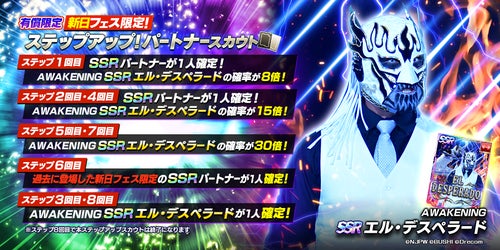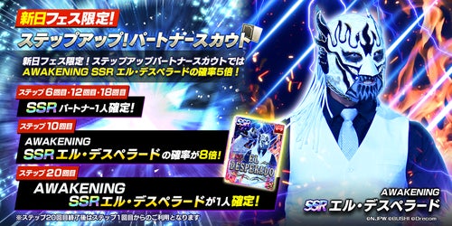 新日SSは2023年5月31日(水)メンテナンス終了後から、SSR「[AWAKENING]エル・デスペラード」が登場する「新日フェス限定!ステップアップ!パートナースカウト」を開催した。