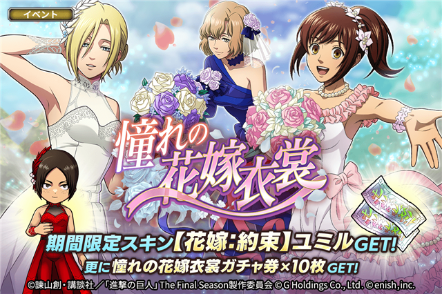 enish、『進撃の巨人Brave Order』で新イベント「憧れの花嫁衣裳」を開催! 花嫁姿の「アニ・レオンハート」「サシャ・ブラウス」「ヒッチ・ドリス」らが登場!
