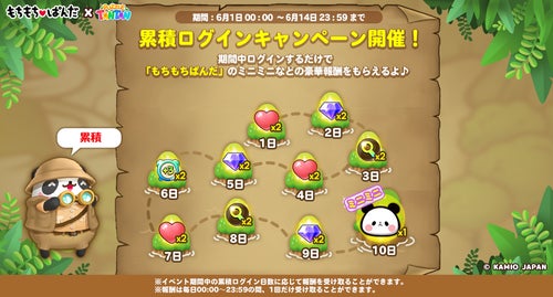 イベント期間中にログインすると、「ダイヤ」などのゲーム内アイテムをプレゼント。10日目には『もちもちぱんだ』コラボ限定のミニミニがもらえる。