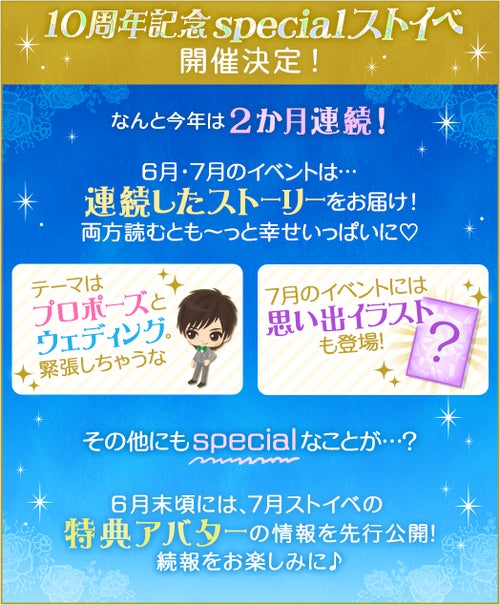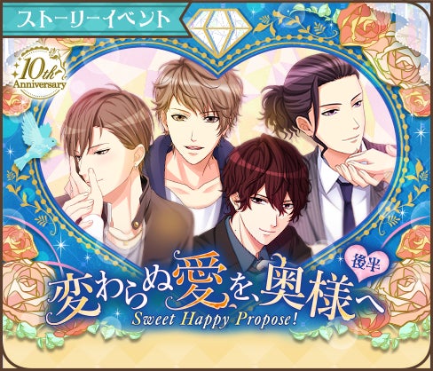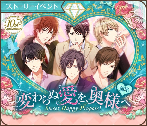 10周年を記念して、全10人のカレが登場する豪華なストーリーイベントを開催いたします。周年に相応しく、「プロポーズ」をテーマにした甘くとろけるストーリーをお届けいたしますのでお楽しみに(ハート)