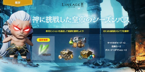 期間中、毎日達成していくデイリー ミッションと2週間でクリアを目指すシーズン ミッションで構成された、新規シーズンパス「神に挑んだ皇帝のシーズンパス」が登場します。デイリー ミッション、シーズン ミッションをそれぞれ達成してシーズンパスEXPを獲得し、パス レベルを上昇させることで、「神に挑んだ皇帝の宝箱(イベント)」や「バイウムの秘密の箱(イベント)」などのイベントアイテムのほか、「魔力が宿った羊皮紙(刻印)」「ピュアエリクサー(刻印)」など、様々なアイテムを報酬として獲得することができます。また、1,000,000アデナを使用することでプレミアム報酬を有効化することができます。最終報酬として、「アインハザードの祝福」20,000を獲得することが可能です。
