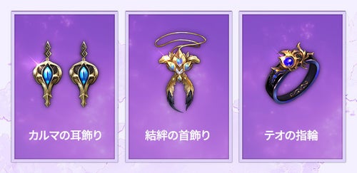 新たに伝説ランクの新装身具「封印されたカルマの誓約」「封印された結絆の誓約」「封印されたテオの誓約」の3種が登場いたします。封印された装身具は放置型フィールドで獲得でき、製作で「大成功」が発生すると封印が解除された伝説+ランクの装身具を獲得できます。