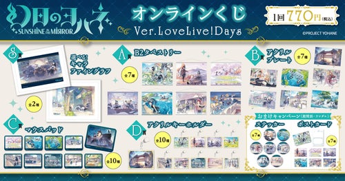 <『幻日のヨハネ -SUNSHINE in the MIRROR-』オンラインくじVer.LoveLive!Days 概要> 販売期間:2023年6月15日(木)17:00~2023年7月6日(木)16:59 販売価格:1回 770円(税込)※別途発送手数料が掛かります。 |