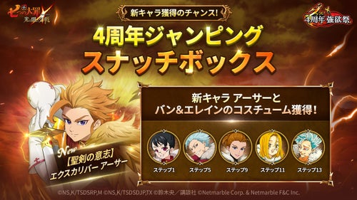 ネットマーブルは、スマートフォン向けシネマティックアドベンチャーRPG『七つの大罪 ~光と闇の交戦(ひかりとやみのグランドクロス)~』(略称:グラクロ)において、本日6月8日(木)のゲームアップデートより、サービス4周年記念イベント「グラクロ4周年強欲祭」の第2弾イベントを開催することを発表した。