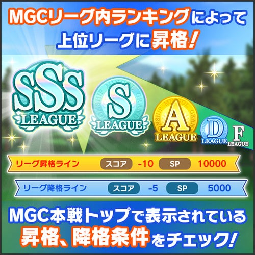 現在のMGCでは、ランク50以上のプレイヤーに与えられる称号「挑戦者」を獲得している方のみ本戦に参加いただけますが、新しいMGCでは参加資格をなくし、かつリーグ制を導入することでより近い熟練度のみんゴルファー同士で白熱したプレイをお楽しみいただける様になります。