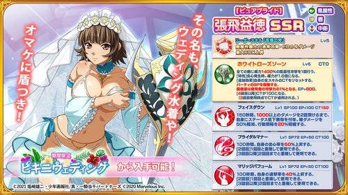 本日開始の「ビキニウェディングガチャVol.1」では、新たに「【ピュアブライド】張飛益徳」(CV:茅原 実里)」が登場。