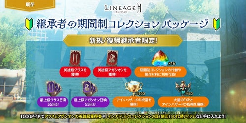 期間中、新規または復帰された継承者様限定で購入ができる「継承者の期間制コレクション パッケージ」が登場しました。クラスとアガシオンの最上級召喚55回分や、「女王の英雄級クラス獲得券II(1回)(刻印)」、「女王の英雄級アガシオン獲得券(1回)(刻印)」「祝福されたアインハザードの聖水(刻印)」50個、「継承者の期間制コレクション代替証(刻印)」16個などがセットになっています。