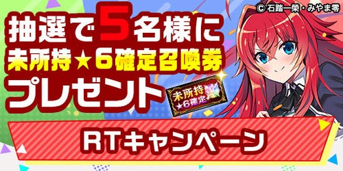 エレメンタルストーリー公式Twitter(@elementalstory)をフォロー、6月15日(木) 18:00にツイートされる該当のツイートをリツイートすることで、抽選で5名に「未所持★6確定召喚券」をプレゼントする。