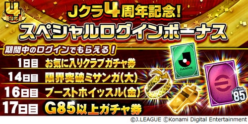 コナミデジタルエンタテインメントは、モバイルゲーム『Jリーグクラブチャンピオンシップ』(以下、『Jクラ』)でゲーム配信開始4周年を記念したキャンペーンを実施している。