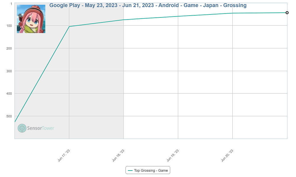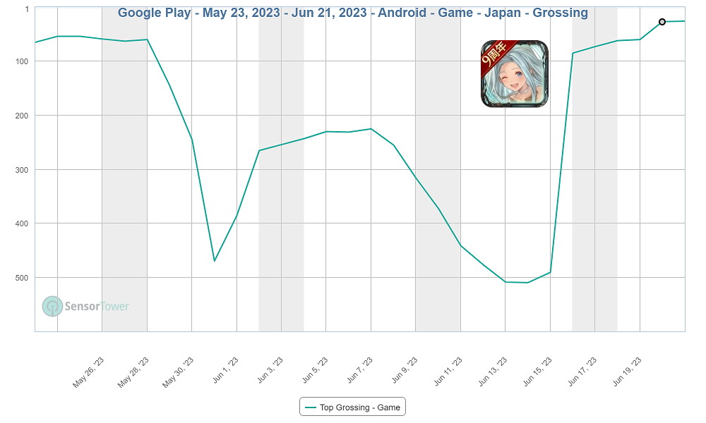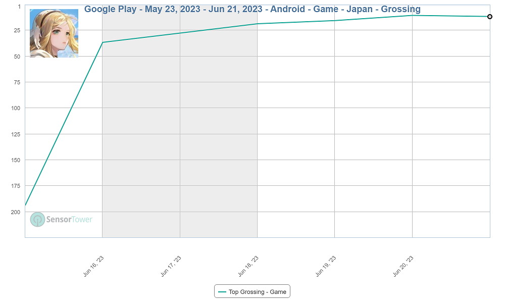 最も目立った動きを見せていたのが、同じCygamesの『グランブルーファンタジー』だ。こちらは61位から34ランクアップの27位に付けている。6月19日19時より、「コスモス」(リミテッドシリーズ)と「バアル」(火属性)が新登場する「グランデフェス」を開催しており、ランキングアップの原動力となったようである。明日以降の動きも注目される。