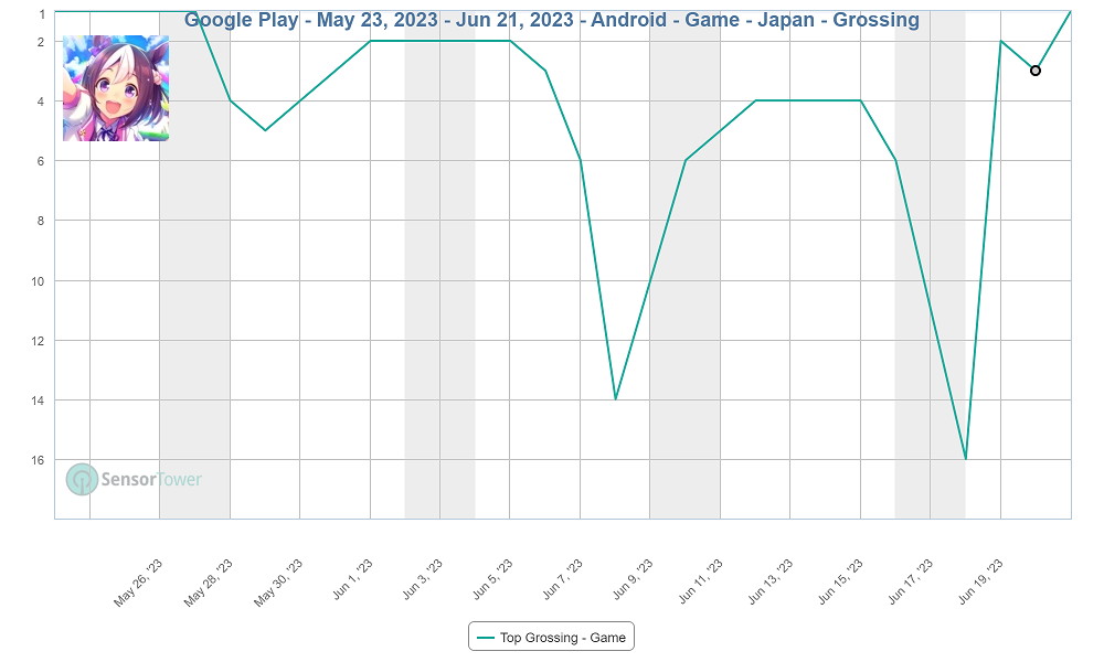| 1 | 3 | ↑2 | ウマ娘 プリティーダービー | Cygames<4751> |