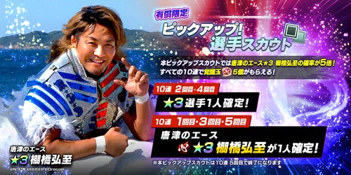 その第一弾として、★3「[唐津のエース]棚橋弘至」が登場する「唐津限定!ピックアップ!選手スカウト」を開催。本スカウトにて、10連スカウトを既定回数行うと、ラインナップに含まれる★3選手からいずれか1人を確定で獲得できるステップアップ仕様となる。また、今回初登場する★3「[唐津のエース]棚橋弘至」は、ピックアップ対象として、スカウト確率が通常の5倍となっている。