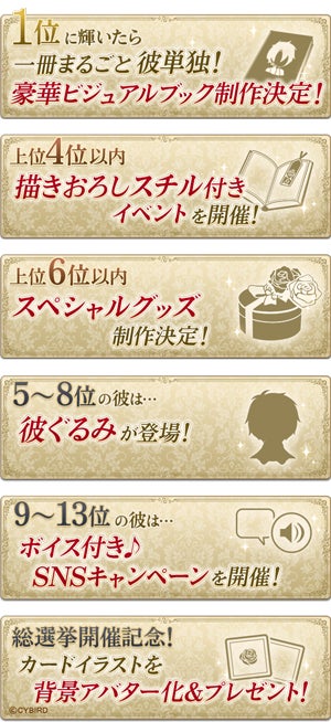 本編ストーリーを読み進めたり、ミニゲームをプレイすることで、“投票券”が獲得でき、気になる彼に投票ができます。また、投票数に応じて豪華な特典を獲得できます。