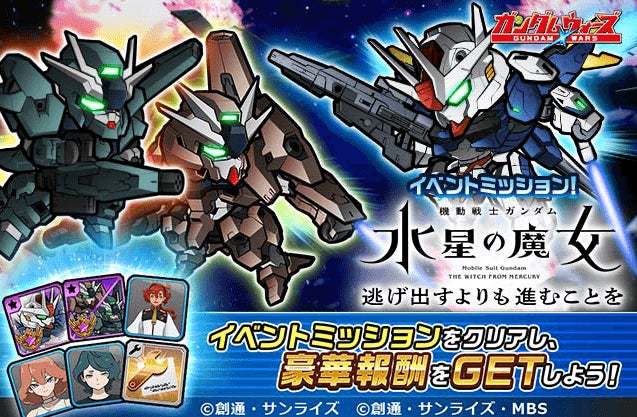 期間中、「イベントミッション! 『機動戦士ガンダム 水星の魔女』逃げ出すよりも進むことを」を開催。 「LINE: ガンダム ウォーズ」において『機動戦士ガンダム 水星の魔女』のイベント第3弾となる今回は、イベント報酬で限定新パイロットの「スレッタ・マーキュリー」や「ソフィ・プロネ」、「ノレア・デュノク」などが入手できる。