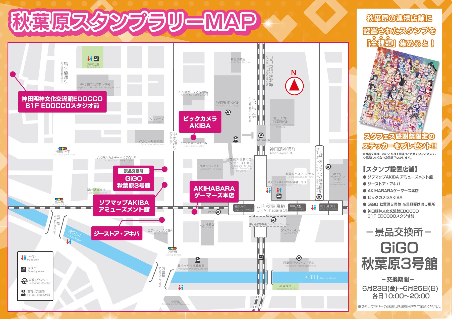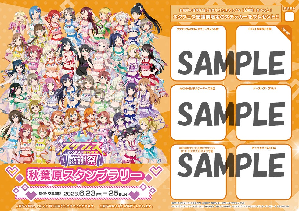 秋葉原のさまざまな場所にスクフェスシリーズ感謝祭2023のスタンプを設置し、すべて集めた人に限定ステッカーをプレゼント。