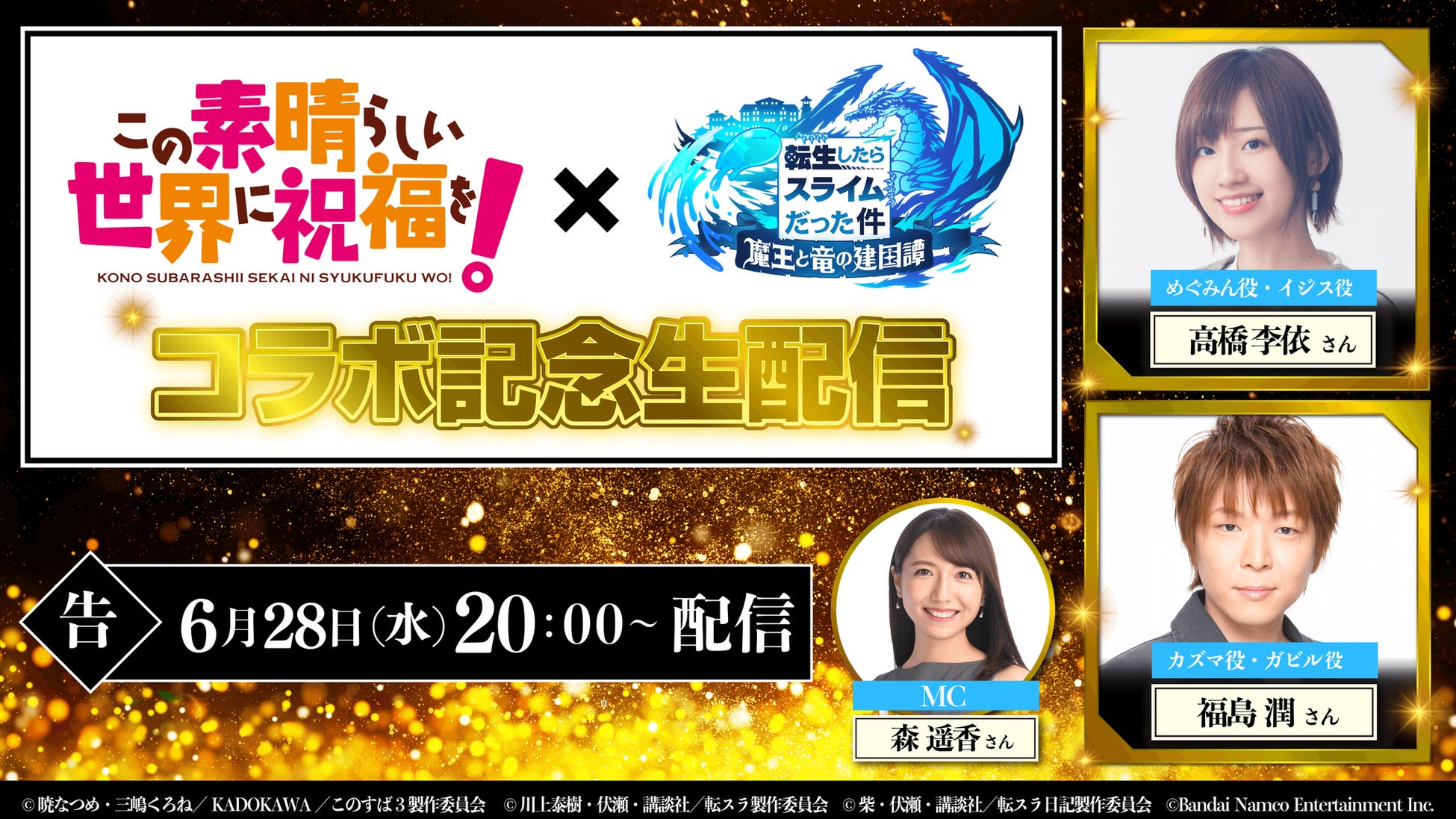 バンダイナムコエンターテインメントは『 転生したらスライムだった件 魔王と竜の建国譚 』(以下まおりゅう)について、「この素晴らしい世界に祝福を!」(以下このすば)とのコラボレーションを開催することを決定した。