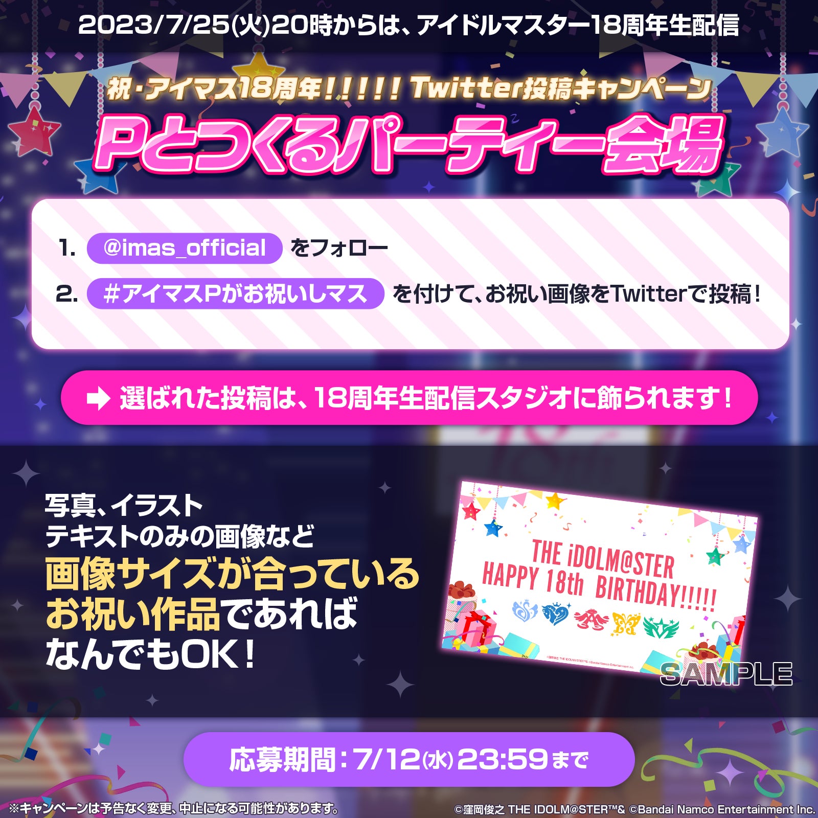 「アイドルマスター 18周年生配信~18th Anniversary Colorful P@rty!!!!!~」を記念して、プロデューサーの皆さんからお祝い画像を募集いたします。