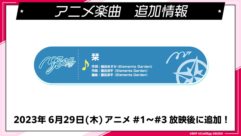 Craft Eggと、ブシロード<7803>は、『バンドリ! ガールズバンドパーティ!(ガルパ)』で、2023年6月27日の公式生放送で、2023年秋より新バンド「MyGO!!!!!」がゲーム内に登場することを発表した。また、2023年6月29日より放送開始のアニメ「BanG Dream! It's MyGO!!!!!」を記念し、ゲーム内でキャンペーンを開催することも発表した。