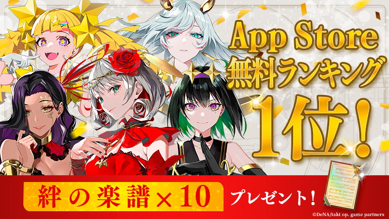 また、6月26日時点でApp Storeの無料ランキング1位を獲得したことを記念して、ガチャ10回分の「絆の楽譜」の配布も実施している。詳細はゲーム内お知らせより確認してほしい。