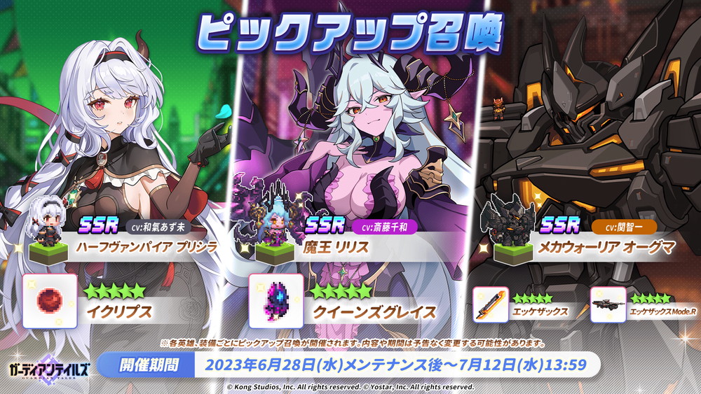 SSR英雄の「親衛隊長 バレンシア」(CV:行成とあ)、「ハーフヴァンパイア プリシラ」(CV:和氣あず未)、「魔王 リリス」(CV:斎藤千和)、「メカウォーリア オーグマ」(CV:関智一)のピックアップ召喚を開催中。