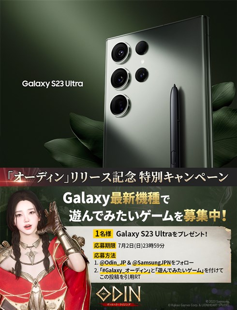 『オーディン:ヴァルハラ・ライジング』は、最新フラッグシップスマートフォン「Galaxy S23 シリーズ」とのコラボ開始を記念し、6月16日から公式Twitterでもコラボ記念フォロー&RT キャンペーンを実施中。