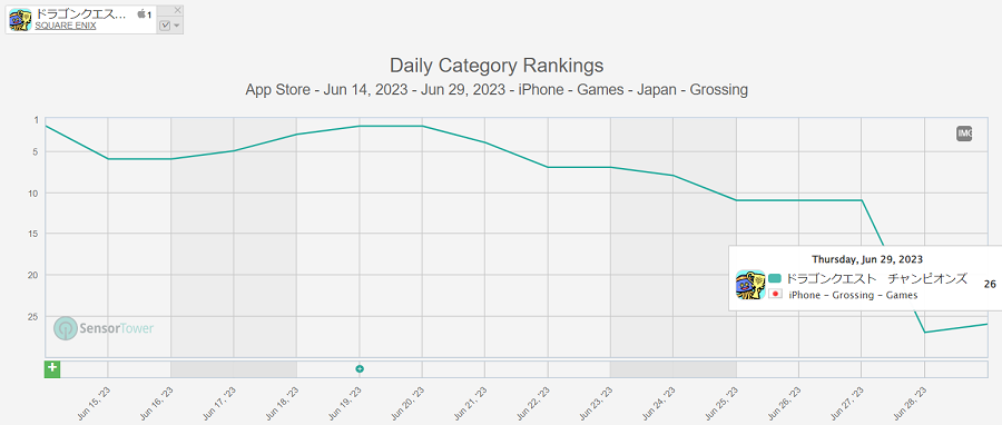 本日(6 月 29 日)15時から開催となった『ドラゴンクエスト XI』コラボイベント中編によって、明日のAppStore及びGooglePlayのセールスランキングで『ドラゴンクエスト チャンピオンズ』の順位は変動するのか、期待したい。