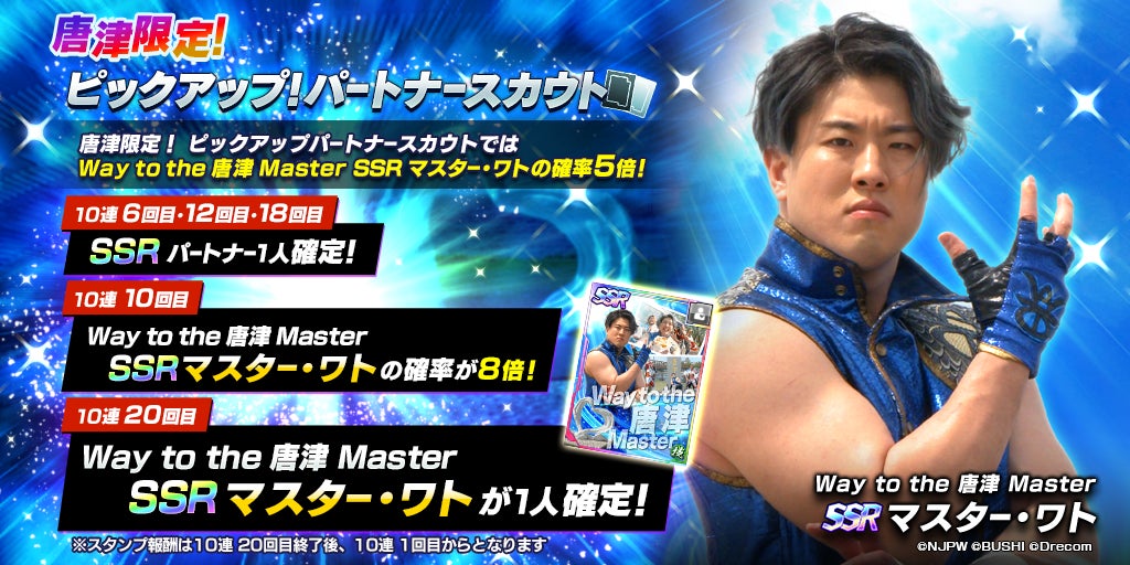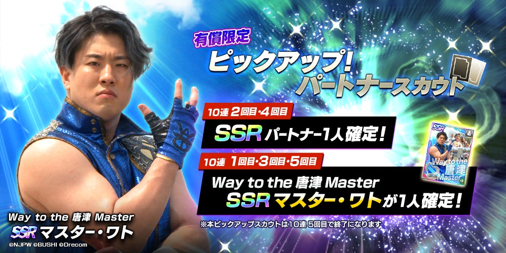 新日SSは2023年6月30日(金)9:00から、SSR「[Way to the 唐津 Master]マスター・ワト」が登場する「唐津限定!ピックアップ!パートナースカウト」を開催。本スカウトにて、10連スカウトを既定回数行うと、ラインナップに含まれるSSRパートナーからいずれか1人を確定で獲得できるステップアップ仕様となる。また、今回初登場するSSR「[Way to the 唐津 Master]マスター・ワト」は、ピックアップ対象として、スカウト確率が通常の5倍となっている。