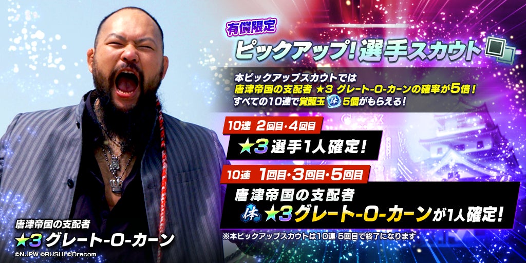 本日より、★3「[唐津帝国の支配者]グレート-O-カーン」が登場する「唐津限定!ピックアップ!選手スカウト」を開催。本スカウトにて、10連スカウトを既定回数行うと、ラインナップに含まれる★3選手からいずれか1人を確定で獲得できるステップアップ仕様となる。また、今回初登場する★3「[唐津帝国の支配者]グレート-O-カーン」は、ピックアップ対象として、スカウト確率が通常の5倍となっている。