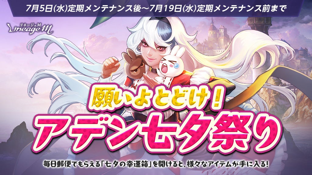 イベント期間中、レベル70以上のキャラクターが存在するアカウントに1日に3回(12時/19時/22時)、「七夕の幸運箱:1段階」を郵便にてお贈りします。