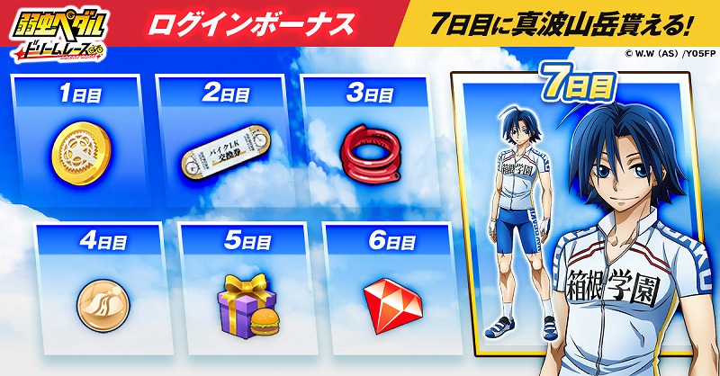 ゲーム開始から7日間、豪華報酬が毎日もらえるログインボーナスを実施する。2日目のログインで自転車、7日間ログインで真波山岳が手に入る。