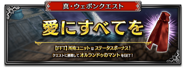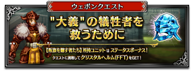 7⽉10⽇(⽉)から、限定武具と強化レシピが⼿に⼊る『FFT』ウェポンクエスト「”⼤義”の犠牲者を救うために」および真・ウェポンクエスト「愛にすべてを」を期間限定で開始した。Lv1のクエストクリアで限定武具「クリスタルヘルム(FFT)」や「オルランドゥのマント」が獲得可能なほか、それぞれの武具の強化に必要なレシピや素材アイテムが⼿に⼊る。