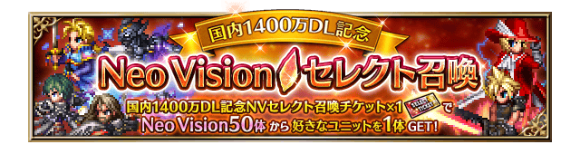 『FFBE』国内1400万ダウンロード達成を記念して、豪華キャンペーンを開催中。「国内1400万 DL 記念Neo Vision セレクト召喚」では、期間中にログインするだけで「NV セレクト召喚チケット」1枚がもらえる。チケット1枚につき、対象の Neo Vision ユニット50体の中から好きな1体を選んで獲得できる。