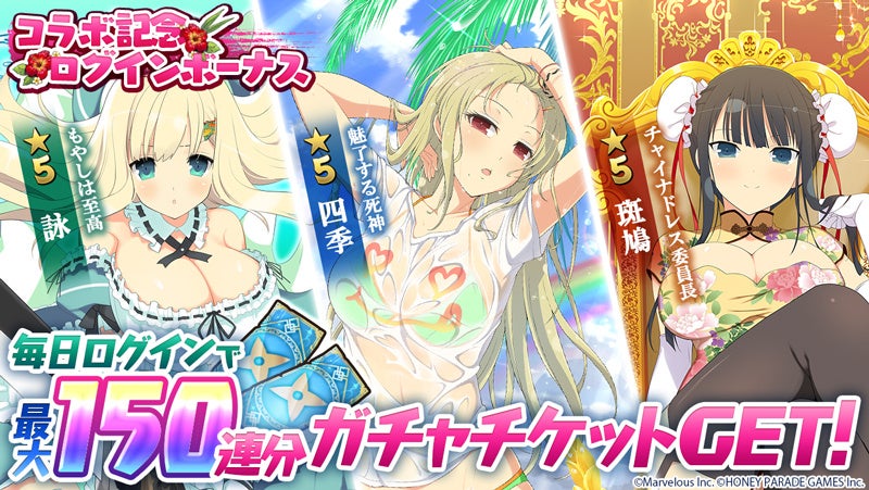 ログインボーナスとして、コラボキャラ「[もやしは至高]詠」「[魅了する死神]四季」「[チャイナドレス委員長]斑鳩」などがピックアップされた5連ガチャが引ける「夏の忍ガチャチケット」がもらえます。毎日ログインすると最大150連分のガチャチケットがもらえます。