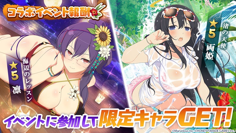 降臨をクリアして濡れPtを集めると、達成報酬としてコラボキャラ「[渚の天使]両姫」が、ランキング報酬としてコラボキャラ「[海辺のレッスン]凛」が獲得できます。