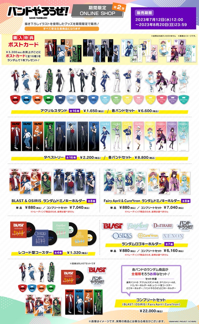 『バンドやろうぜ!』のBLAST、OSIRIS、Fairy April、Cure²tronの16名イラストを使用した新規グッズを受注販売します。