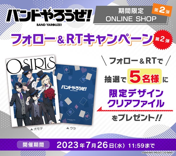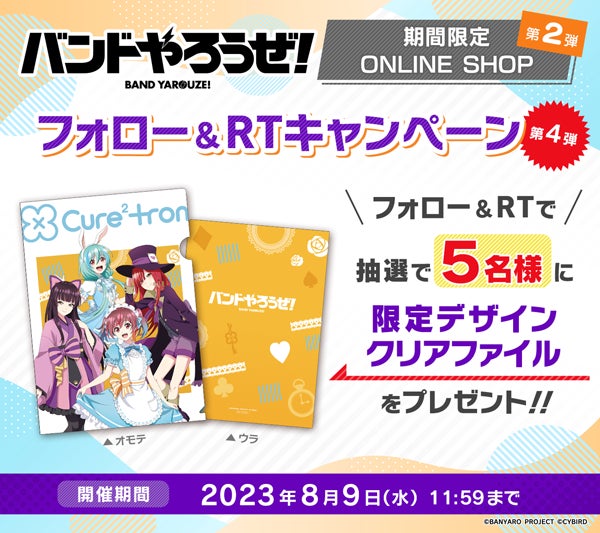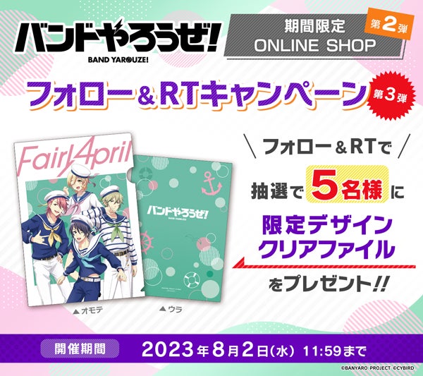 『バンドやろうぜ!』期間限定ONLINE SHOP第2弾のOPENを記念して、各バンドのオリジナルクリアファイルが抽選で当たるキャンペーンを5週にわたって開催します。 CYBIRD ONLINE SHOP Twitter(@CYonlineshop)をフォローし、該当ツイートをリツイートすることで応募できます。