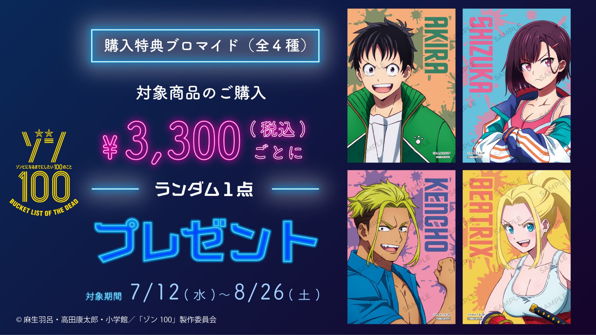 販売期間中(2023/7/12~8/26)、TVアニメ『ゾン100~ゾンビになるまでにしたい100のこと~』の合計注文金額3,300円(税込)購入ごとにランダムで特典(全4種)を1点プレゼント。